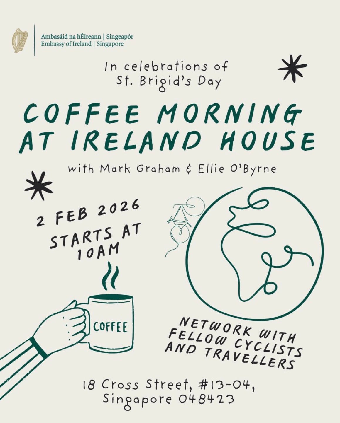 The Embassy of Ireland to Singapore and Brunei has provided us with the perfect opportunity. We will visit the embassy here in Singapore on February 2nd to give a talk at a coffee morning they’ve arranged for us. We might stick a little candle in our scones.