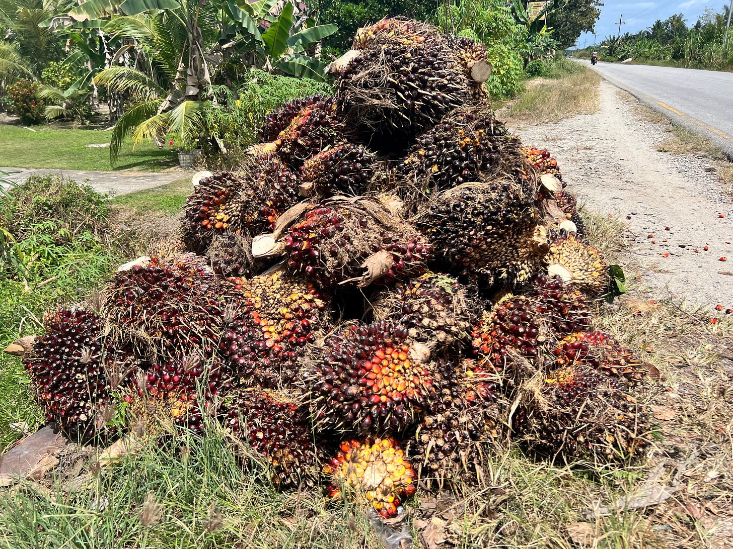 The palm trees continued for miles and miles in every direction. Long before the palms started to thin out as we neared the public road, we could see plumes of thick black smoke billowing into the clear blue sky from the processing plants that separate the palm oil from the clusters of nuts cut from the trees.